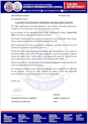 The management of the SRC-UEW released a Caution to Students Vendors and Security Issues of the Artist Night (Freshers Akwaaba)