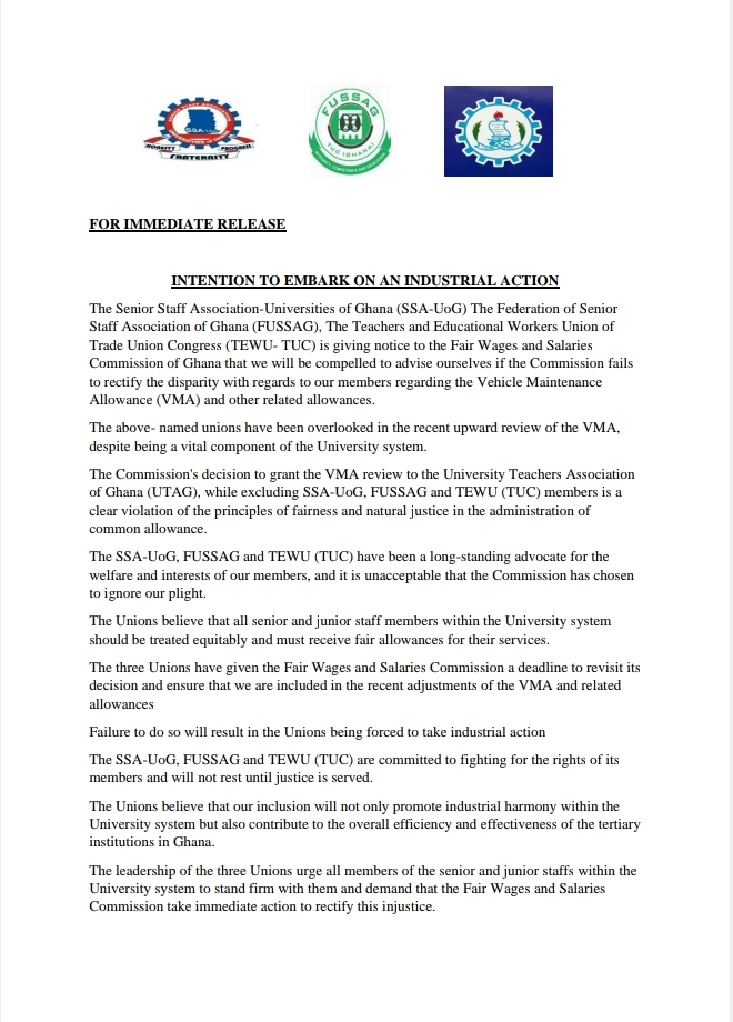 “The Senior Staff Association-Universities of Ghana (SSA-UoG) The Federation of Senior Staff Association of Ghana (FUSSAG) and the Teachers and Educational Workers Union of Trade Union Congress (TEWU-TUC) are giving notice to the Fair Wages and Salaries Commission of Ghana that we will be compelled to advise ourselves if the Commission fails to rectify the disparity with regards to our members regarding vehicle maintenance, according to their statement.